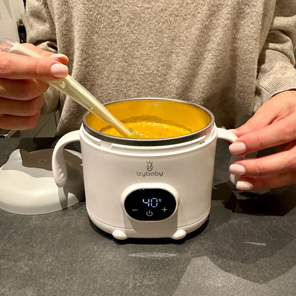 Selección de la temperatura entre 40°C y 50°C para calentar todo tipo de alimentos. Tarda entre 5 y 10 minutos en calentar la comida de bebé o mantenerla caliente